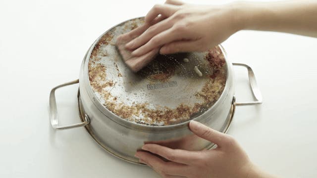 細かい研磨粒子がこびりついた焦げや黒ずみを強力に洗浄します。