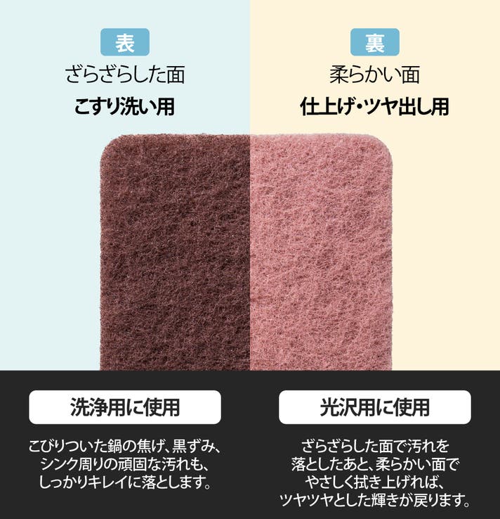 ざらざらした面でゴシゴシこすって洗浄した後は、光沢を出すための柔らかい面を使って磨き上げると、さらにピカピカに仕上げることができます! 鍋やフライパンにこびりついた焦げや汚れがなかなか取れず、新しいものに交換するか悩んでいるなら、この焦げ落としクリーナーでピカピカに大変身させてみませんか?