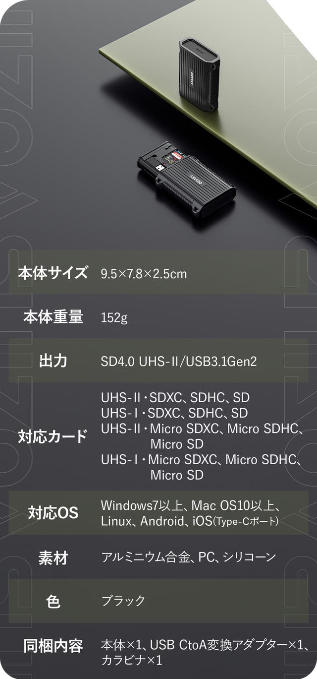 - SD4.0 UHS-II、USB 3.1 Gen2対応!最高速度10Gb/sで待ち時間超削減!