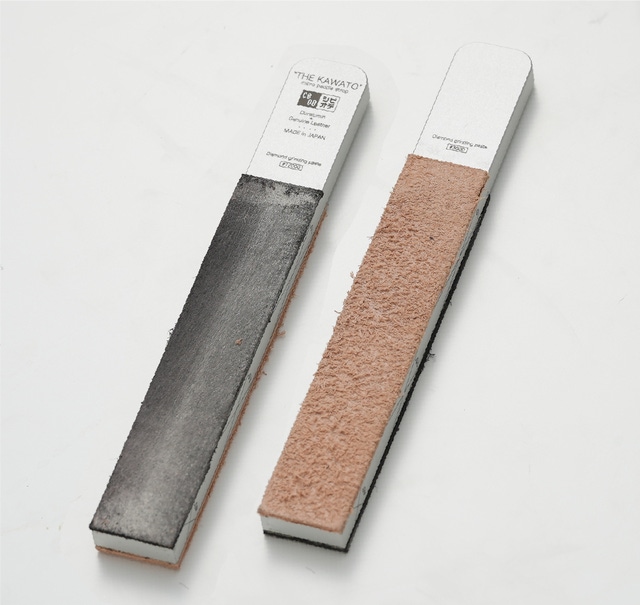 ※例えば砥石の仕上げ番手が#2000の場合、革砥の研磨剤は#3000(スキン色)、さらに仕上げに#12000(黒色)の両方を使用する。