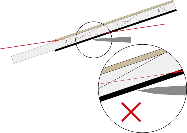 色が消えた位置から判断して、角度を浅くしたり深くして調節し、ペンの色が刃先から均等に消える位置を見つければ簡単に研ぎ角度が分かるはずだ。(この時にサイドにあるガイドラインを確認して角度を覚えておくと、次回よりサインペンは必要無くなるのだ)