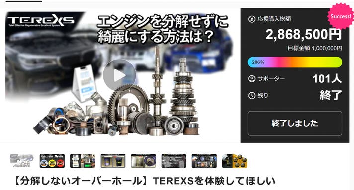 本製品はガソリンエンジン車両には非対応となります。ご購入の際はご確認お願い致します。 納期につきまして応援購入数が想定を上回り生産が追い付かない、または自然災害等思わぬ事態が発生し納期遅延が想定された場合は、ご購入頂きました皆様への情報共有を早急に行い問題解決にあたります。 エンジン内部洗浄セットリターンをご購入のお客様への施工はご予約頂きました順番に沿って順次施工となりますためリターンのご提供がプロジェクト終了後になる場合がございますことをご了承ください。 原則としてサービス提供の遅延や配送遅延に伴う応援購入のキャンセルは出来ませんが、リターン配送予定月から3ヵ月を超えた場合には、希望者に限りキャンセルにて対応させていただきます。 応援購入後のキャンセルにつきまして、サポ―ター様都合によるキャンセルや返金はお受けできません。ご了承をお願い致します。尚万が一商品不良等が有った場合は代替品にて対応させていただきます。