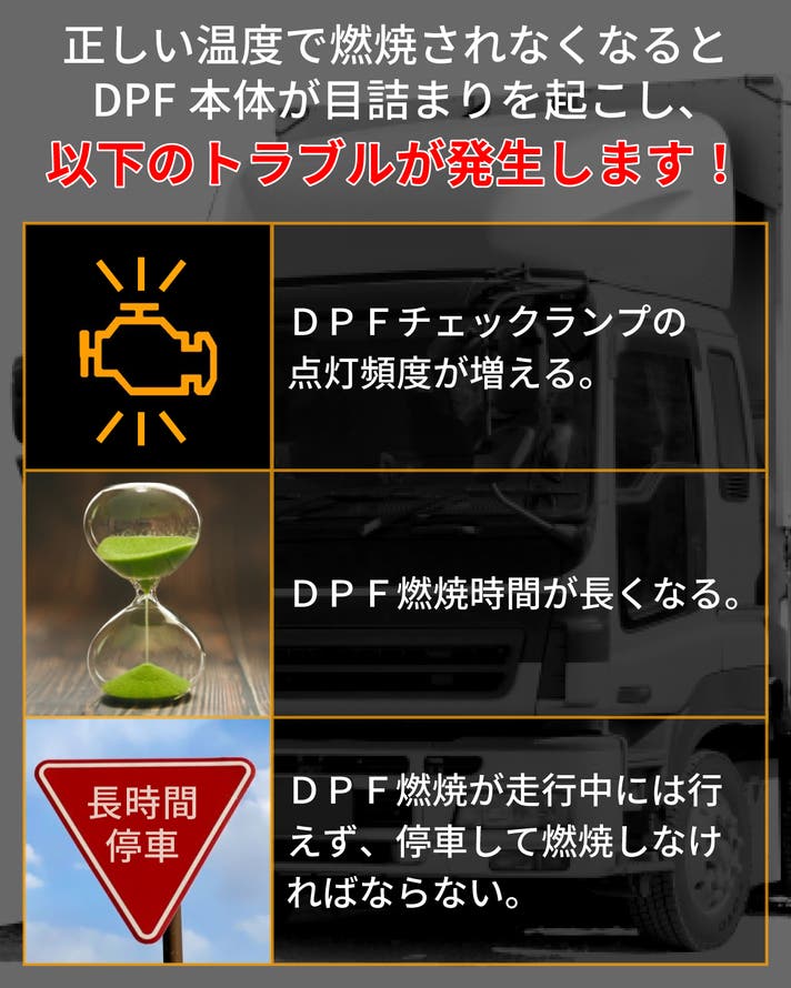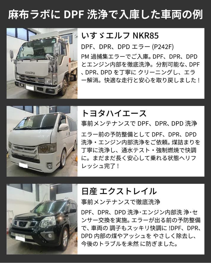つまりはDPFが目詰まりすると前述のように思わぬ事態に陥るため、日常からインジェクターメンテナンスを意識し、「DPFを詰まらせないこと」が一番大切だと弊社は考えております。