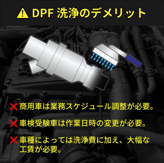 DPFの洗浄には、DPF本体を車両から外す必要があり、その期間(3~5日)は車両が使用出来ません。お仕事で使用している車両はその期間の「スケジュール調整」「車検を受ける車両は作業日時の変更」が必要で、また車両によっては構造上DPFを外すのに工数を要し、DPF洗浄費用に加え「大幅な工賃」が発生する場合もございます。