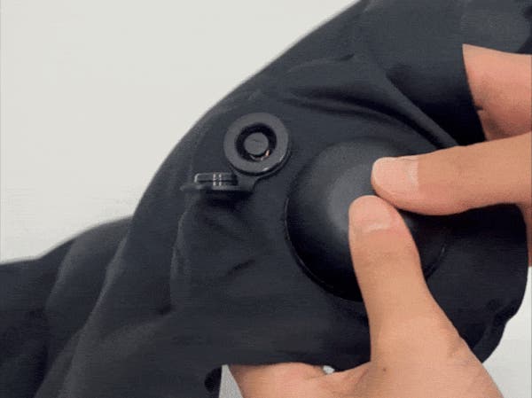 黒色エアーバルブのキャップを外す。中央のボタンを押す (ボタンを押しながら本体に圧力を加えると素早く空気が排出されます)