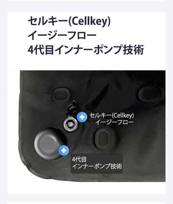 イージーフロー4代目インナーポンプを搭載。自社従来の口で膨らませるタイプではなく、内蔵されたポンプを手で押すタイプで衛生的に素早く膨らませることができます。 CELLAIRだけのセルキー(Cellkey)ボタンで空気の入れ具合を微調整し、体型や好みに合わせてお使いいただけます。