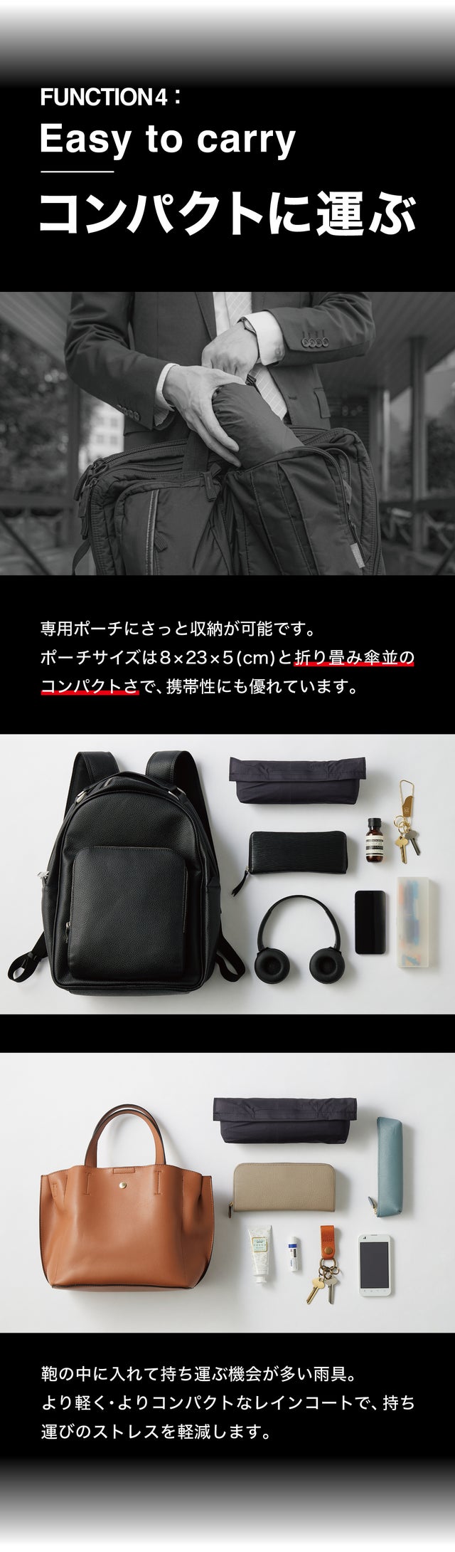 - 折り畳み傘並のコンパクトサイズに。ストレスなく持ち運べる「スマート収納」