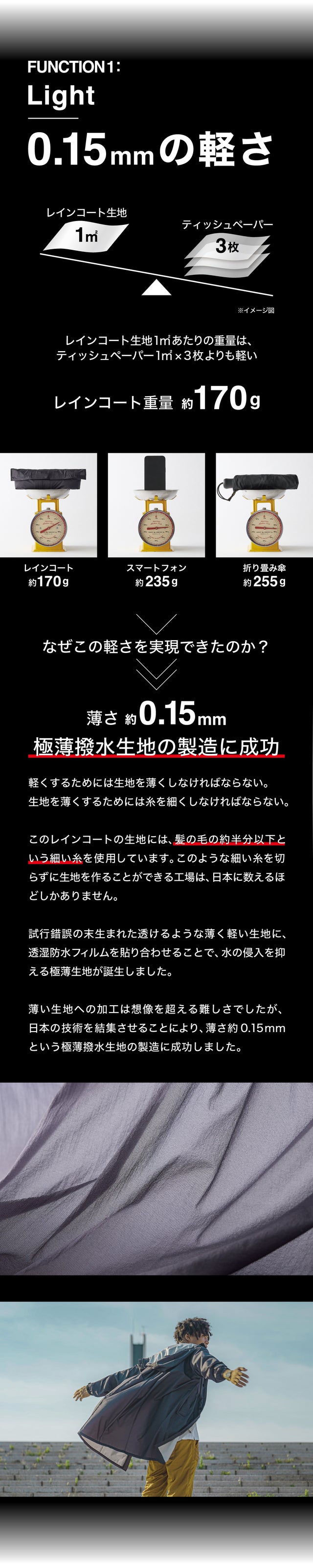 このレインコート最大の開発ポイントは「重量」でした。