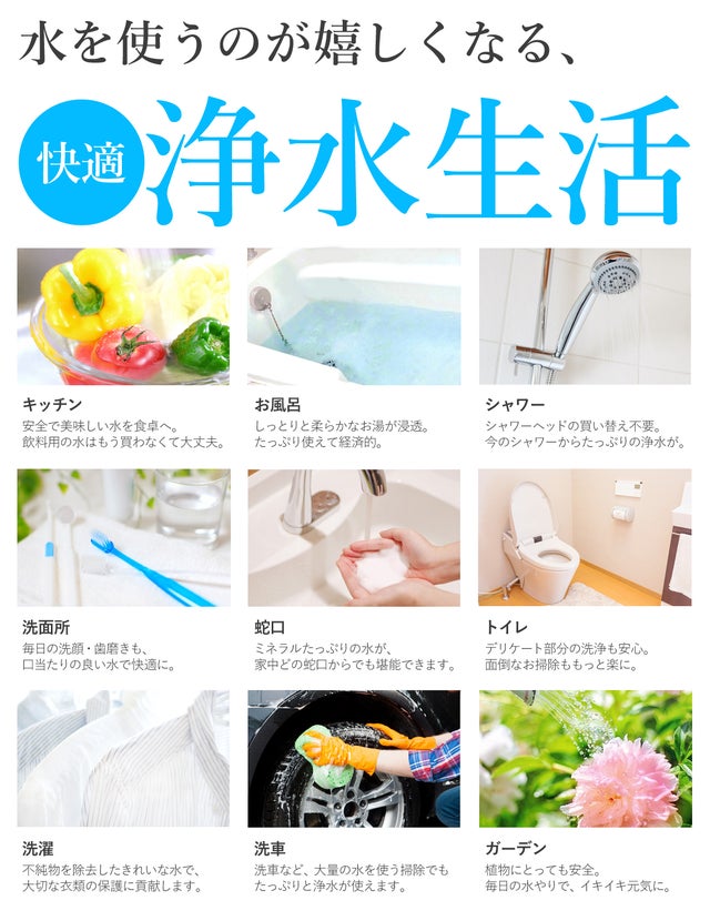 A 浄水をご利用する範囲が制限されないことです。(家全体、キッチン、お風呂場、庭の水散栓など)、すべての水場で浄水をご利用いただけます。また、一般的にキッチンに設置する据置型のように、シンクに場所をとらないこともメリットです。