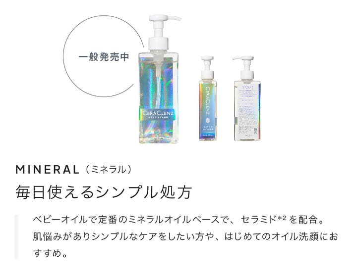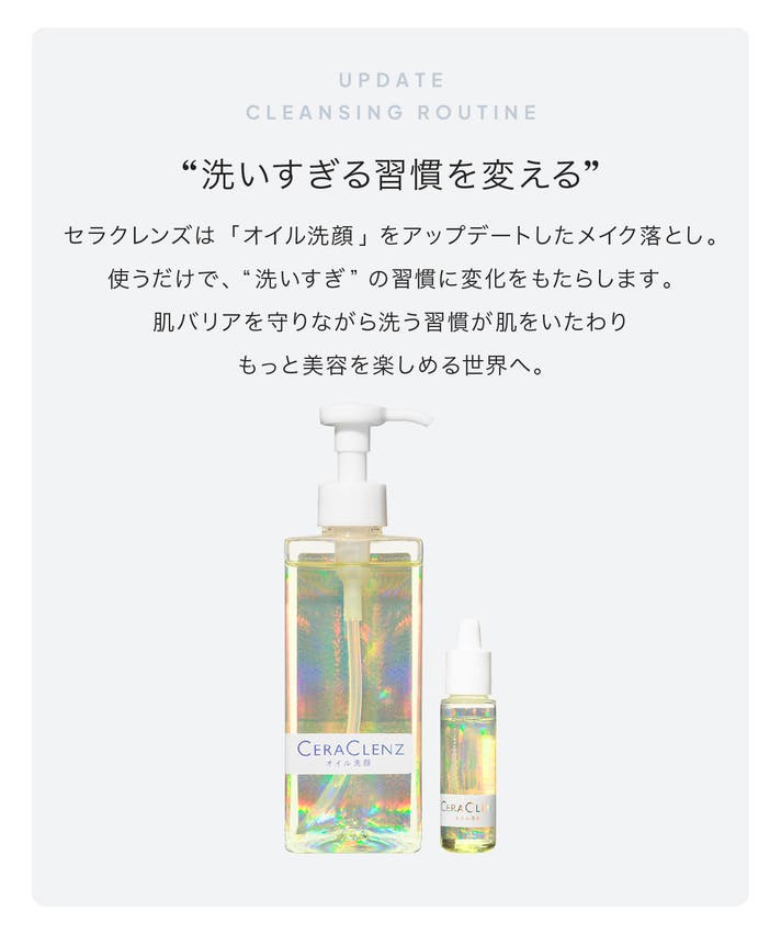 “洗いすぎ”を防ぎながらクレンジングを行う方法として、オイルをメイクに馴染ませ、ティッシュオフによって除去する「オイル洗顔」に着目しました。このオイル洗顔に存在したいくつかの課題を解決する独自処方を開発し、メイク汚れを落としながらスキンケアができる新しいオイル、セラクレンズが完成しました。