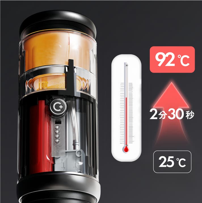 内部で自動加熱し、そのまま抽出まで行うため、外出先でもすぐ淹れたてを楽しめます。