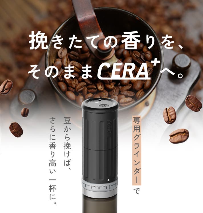 コーヒーの香りと味わいは、挽きたてかどうかで大きく変わります。Cera+専用のコンパクトグラインダーなら、旅先やアウトドアでも豆から挽いてすぐに抽出できます。より豊かな香りと、フレッシュな味わいを手軽に楽しめます。