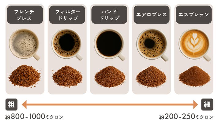 一般的に“エスプレッソは0.02mm-0.025mm”の細かさを指します。CERAGRINDERを使えば20μm単位で自由に調整できるので、同じエスプレッソでも、細かめなら濃厚に、粗めなら軽やかに自由に理想の味を探すことができます。