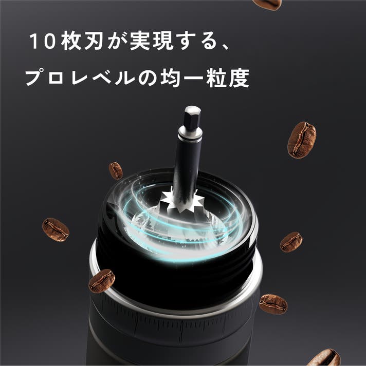 刃の枚数が多いことで、豆にしっかり“切り込み”を入れながら粉砕でき、粒度のそろった均一な挽き心地を実現します。