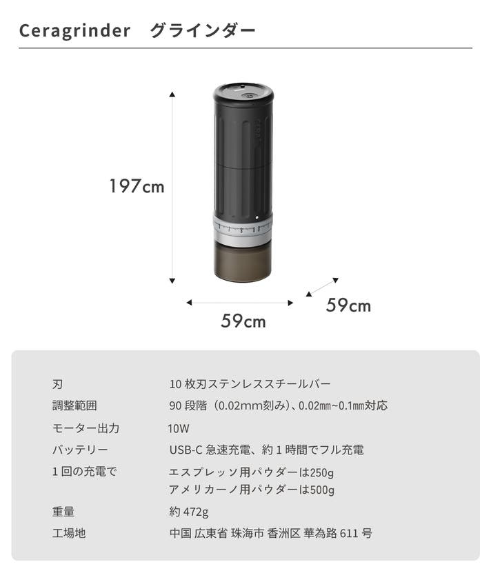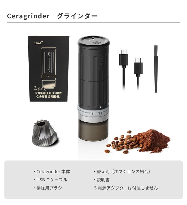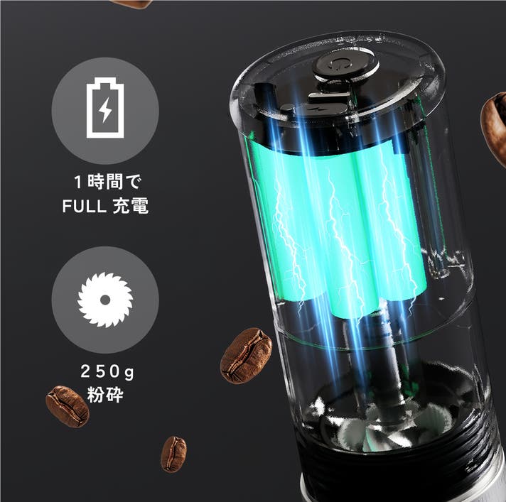 Cera+グラインダーはUSB-C急速充電対応。わずか1時間でフル充電でき、1回の充電で250g以上の豆を粉砕できます。