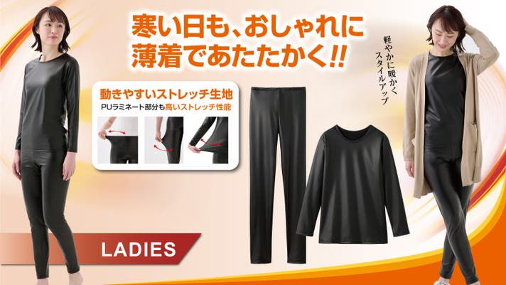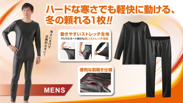 この防風保温ストレッチウエアは、風を通さずしっかりと暖かさをキープできるインナーです。二層構造のPUラミネート素材を採用しており、防風効果を高めています。肌側には裏起毛を施しており、保温性も向上。寒い季節でも快適に過ごせる設計です。また、良く伸びるストレッチ生地を使用しているため、動きやすさも抜群です。薄くて軽量ながらも高い保温性を実現しており、これ一枚で寒さ対策が可能です。外出時や屋内での活動時も、快適に過ごせる優れたインナーです。