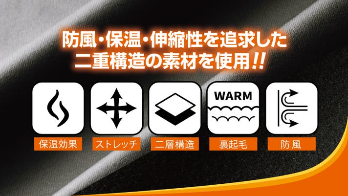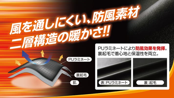 - 高い防風・保温性能:PUラミネートの二重構造と裏起毛で風をシャットアウトし暖かさをキープします