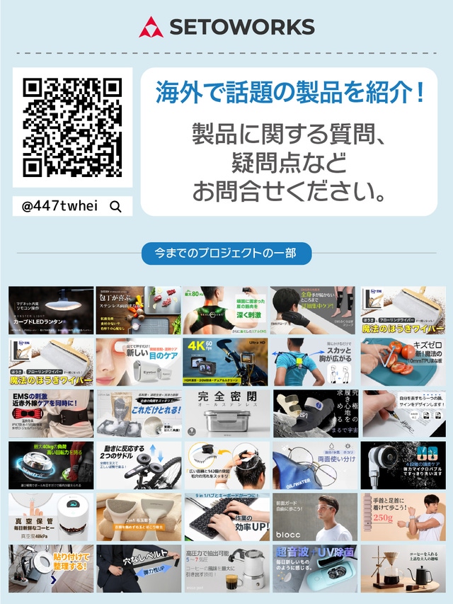 setoworksは日本の新しい製品を外国にいち早く紹介する事業を始め、海外の新しい商品や直接企画した多様なプロダクト製品を日本国内に紹介する事業を展開しています。たくさんの応援の程よろしくお願い致します。