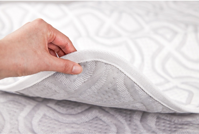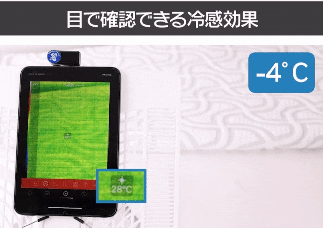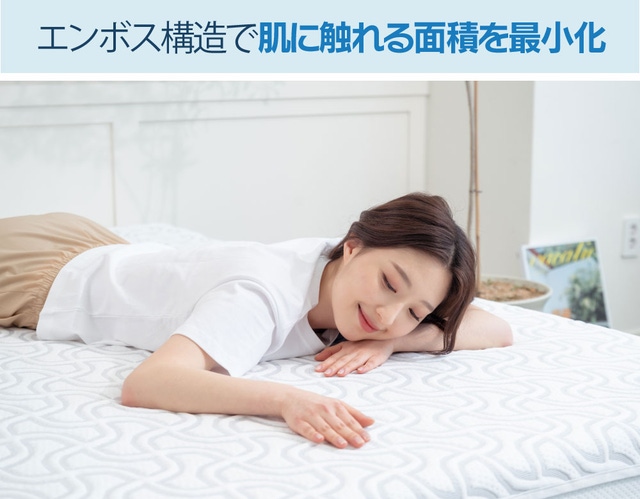 エンボス加工は優れた熱伝導率と熱拡散率が体温上昇を抑制するため、高い接触冷感を感じられます。 そのため、生地表面についた汗などが密着せず朝までサラッとしたひんやり感を実現します。