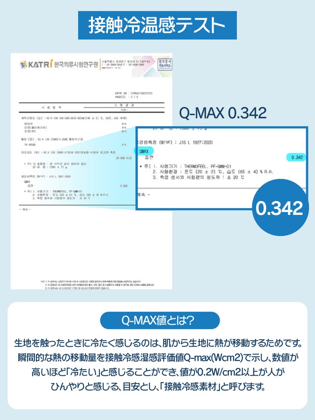 C-guard冷感パッドのQ-max値は 温度差20度の場合、基準値を上回る 0.342w/cm2で非常にひんやり感じるということが出来ます。