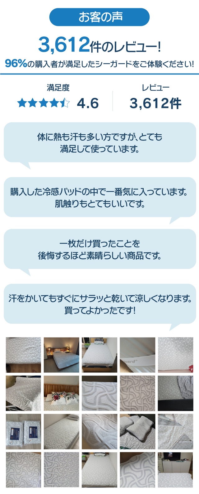 夏の準備のために冷感パッドを探していましたが、どれが良いか悩んでいました。そんな時に肌に触った瞬間から涼しい性能とちょうど良いサイズ、価格のシーガードを見つけぜひ皆様にも紹介したいと思いました。