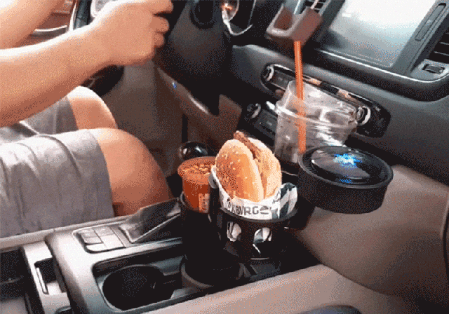 テイクアウトしたハンバーガーもカップホルダーの中にすっぽり入ります!まるで車内は映画館!!