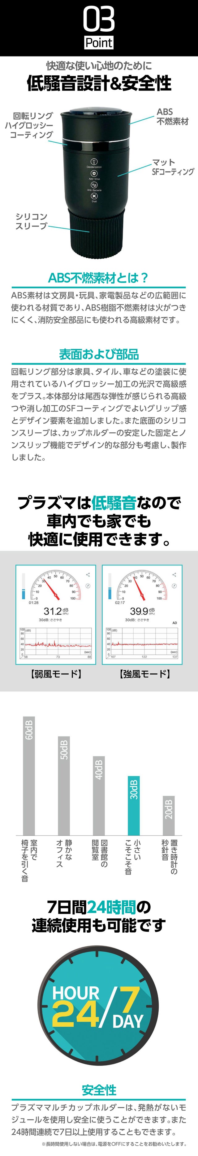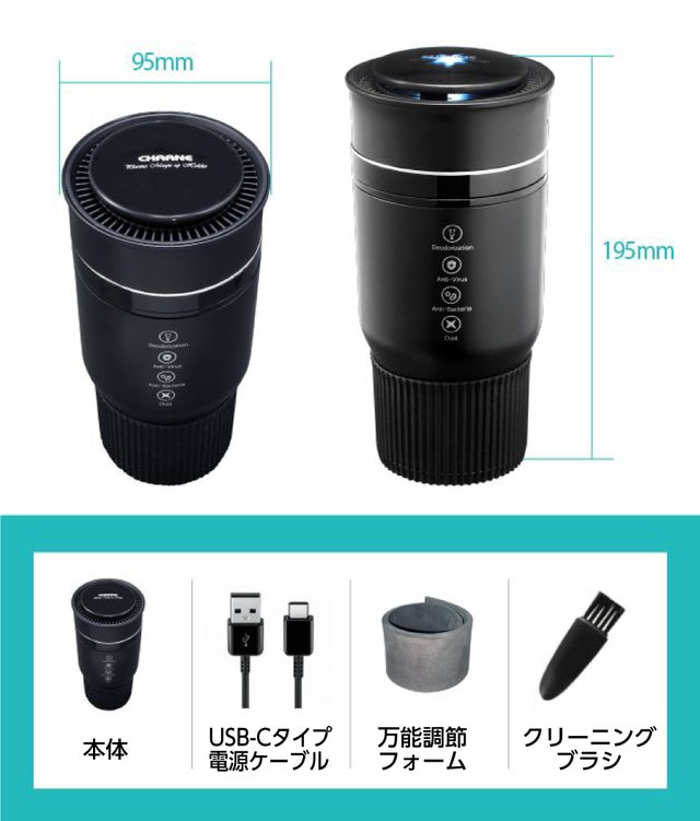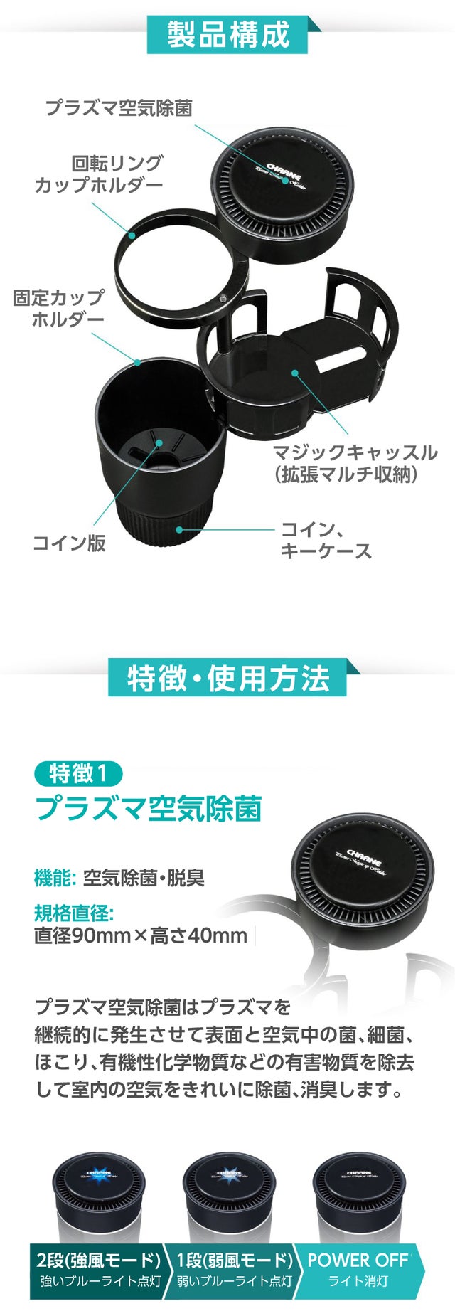 - カップホルダーなのに空気清浄機!約20種類の検査を受け、除菌消臭力あります!花粉にも!