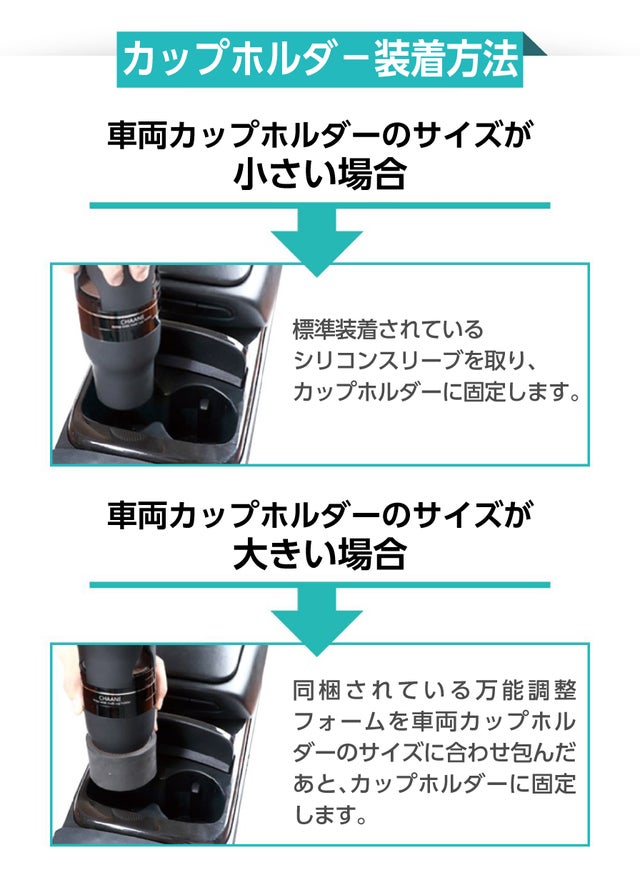 - 場所もとりません!車内のカップホルダーに置けます。しかも様々な車に取り付け可能。
