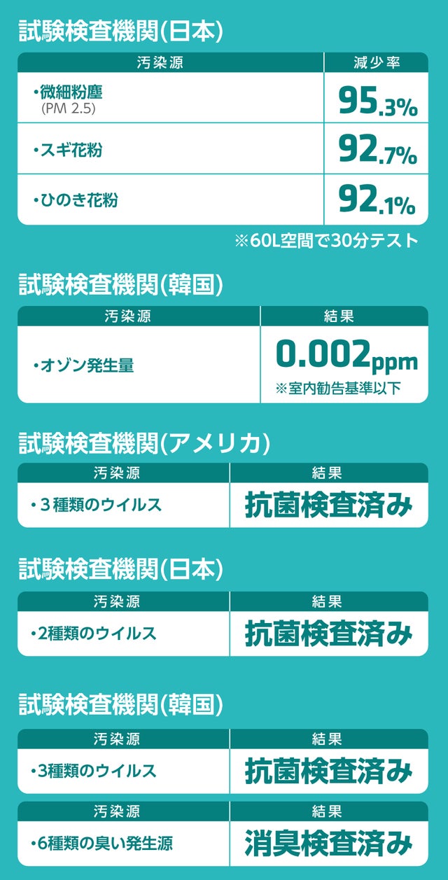 ※1分当たりに1800万個のマイナスイオンを発生させ、空気中の細菌、ウイルス、または花粉を除去します。