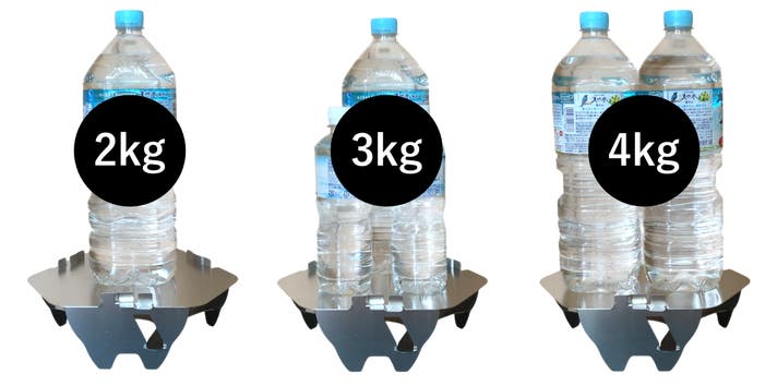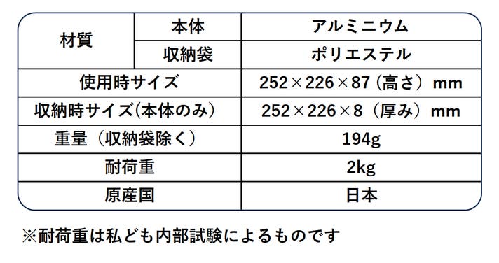 4kgで脚は問題ありませんでしたが、天板にたわみが確認されましたので、暫定で3kgをMAX値として仮定。「JIS S 1205」の基準に準拠し、3kgで7日間放置。天板、脚ともにたわみは確認されませんでしたので、安全係数1.5の設定で、耐荷重は2kgとしております。