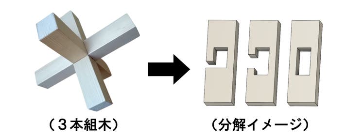 でも、軽量・コンパクト、簡単なテーブルと言葉では言えるけど、具体的にどんな?と考えてもなかなかいいアイデアが出てこないので、改めて組み立て型、折りたたみ型テーブルのメリット、デメリットを整理。それで考えたのが、「両方のいいとこどり」。つまり、「限りなく組み立て型の加工だけで、折りたたみテーブルにする」、「加工工程、パーツも減らすことができたら、軽量化、コストダウンにもつながる」という単純な発想でした。でも、何から手をつけたらいいのかわからなかったので、色々な組み方、工法を調べるためにまずは日本建築の継ぎ手、仕口を研究。これならできるかもしれないと出会ったのが「3本組木」