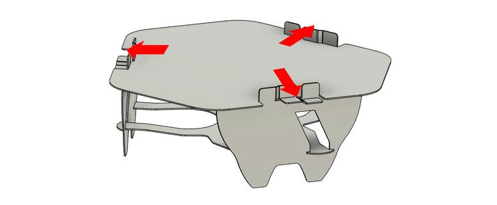 ・脚のある方向(下記図の赤矢印の方向)に力を加えると脚が倒れる恐れがありますのでご注意ください。(キャンプ道具、飲み物などを置くレベルでは問題ございません)