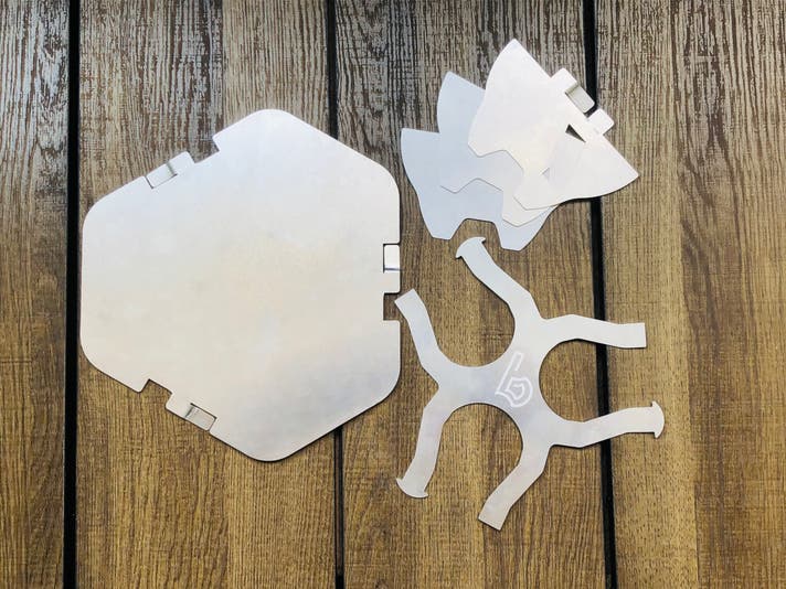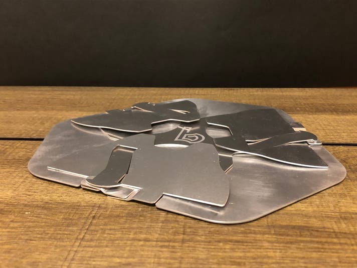bished商品第1弾として、2023年12月にMakuakeにてリリース。円形の焚き火台はディッシュ型で収納時は厚みのある商品が多いですが、直径30cmでもB5サイズにフラットに収納。アルコールストーブの防風スタンドとしても使えます。薪組みを愉しみ、炎のゆらぎをゆったりと愉しむ焚き火台です。
