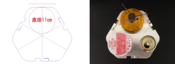 直径11cmのOD缶(250缶)が置けて、他に2つの物を置けるようにした天板。「シカクマル」で実用性とデザイン性を追求したサイズと形状。