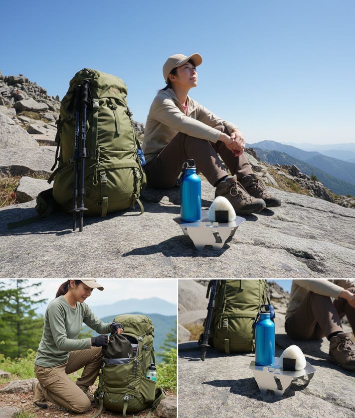 登山の休憩場所って限られてるし、休憩時間も同じだから備え付けのテーブルは既にいっぱい。でも、食べ物だから地面に直接置きたくない...そんな時には「ちゃぶスタmini」