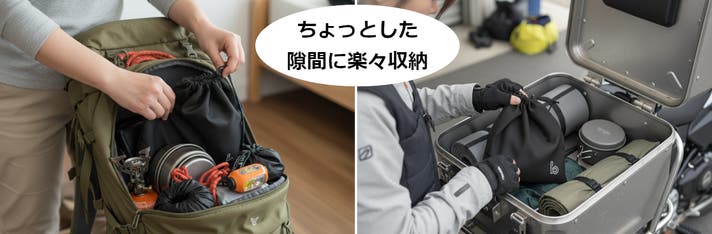 収納時の厚みは約8mm。超薄型なので、バックパック、バイクのパニアケースなどにサッと隙間収納。これでパッキングの手間を解消!