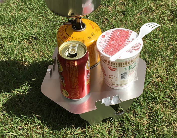 シングルバーナー(OD缶)、飲料、食べ物の3つの物が置ける天板サイズ。これで、ちょい飲み、ちょい食べ思いのまま!