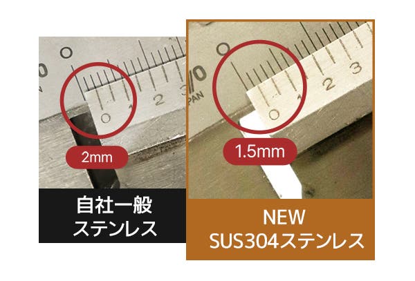 適度な重量感と安定性で、より手軽に料理を楽しめます。従来の一般的なステンまな板は厚さが2mmですが、オールステンレスまな板は厚さを1.5mmにし重さをカットしました。