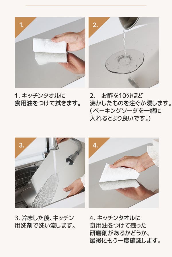 A. 1. キッチンタオルに食用油をつけて拭きます。