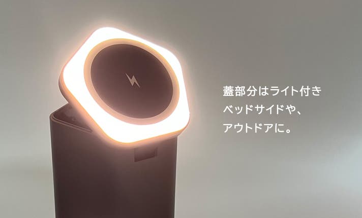 蓋部分がライトとして使えるため、寝室やキャンプなどさまざまな場面で便利にお使いいただけます。