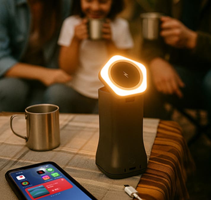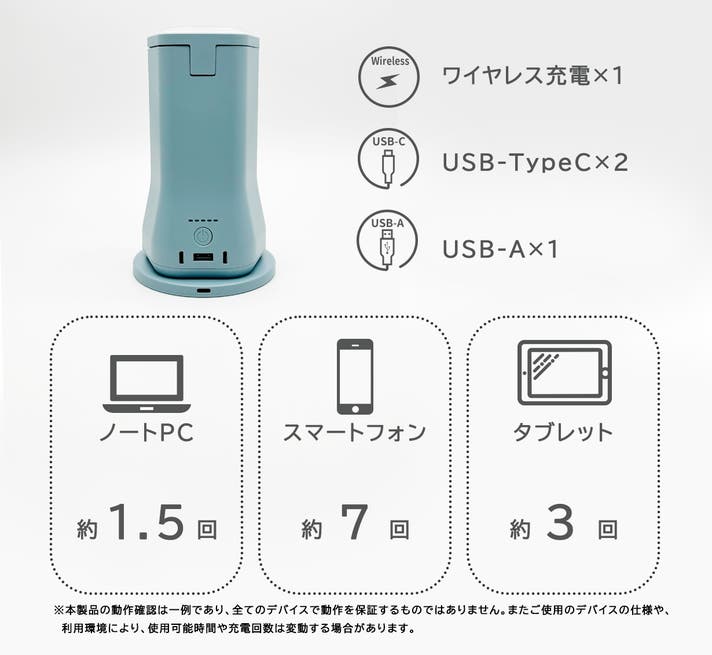 スマホスタンド機能とワイヤレス充電を兼ね備えており、料理中のレシピ検索やWEB会議など、両手を自由に使いたいシーンで大活躍します。給電デバイスはノートPC、スマートフォン、タブレットなど、日常使いに十分なバッテリー容量を備えています。