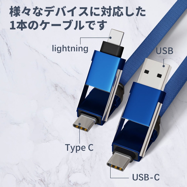 - 4in1 USBケーブル。60Wの高速充電、1本で複数のコネクタに対応できる