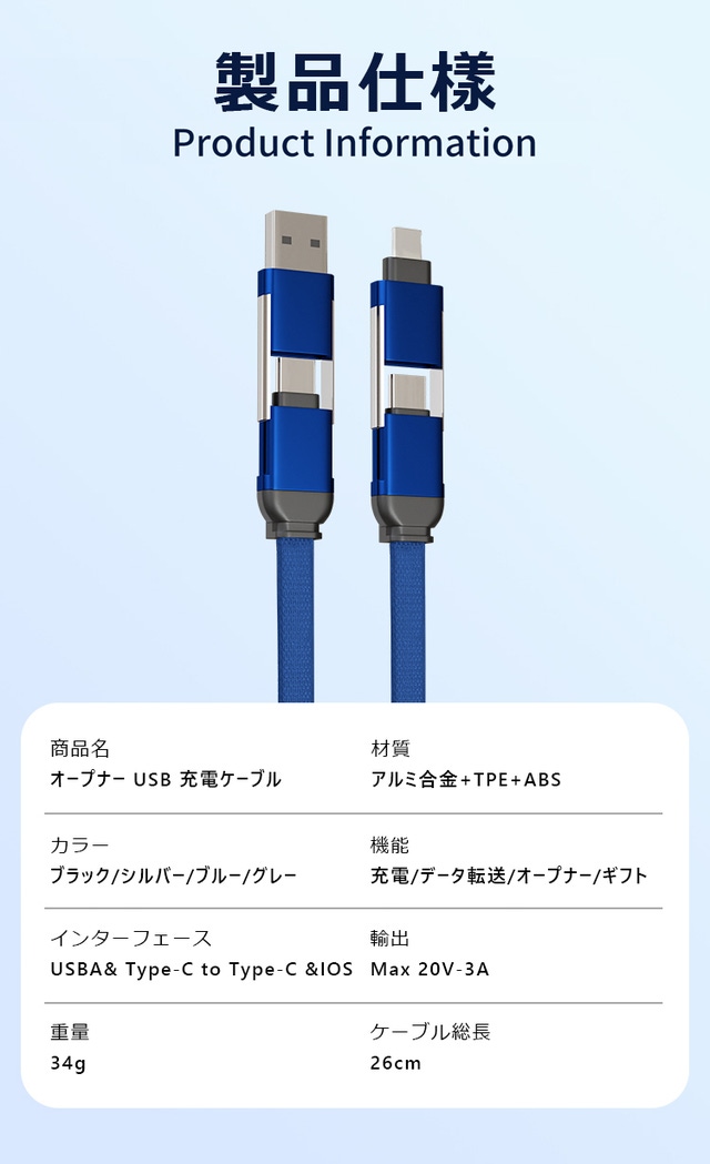 数の充電ケーブルを持ち歩くのは面倒ではありませんか?このUSB充電ケーブルは、iPhoneやAndroidスマートフォン、タブレット、Bluetoothイヤホン、デジタルカメラなど、様々なデバイスに対応した1本のケーブルです。