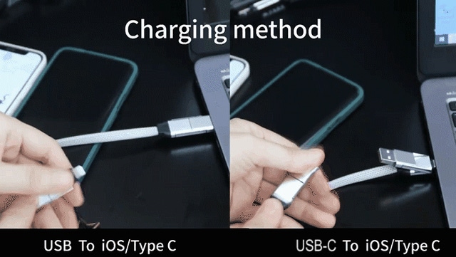 この製品の最大の魅力は、4つの端子を一体化したデザインであることです。従来の充電ケーブルでは、異なるタイプのスマートフォンやタブレットを充電するために、複数のケーブルや変換コネクタが必要でしたが、この製品では、USB&USB-C to Lightning、TYPE-Cの4種類の端子を1つのケーブルに統合しています。そのため、ユーザーは複数のケーブルを持ち運ぶ必要がなくなり、充電の手間が大幅に省けます。