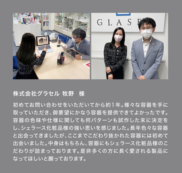 利益率が低くなってでも容器選びも妥協しませんでした。たくさんの会社様から多くのサンプルを取り寄せたり、実際にショールームにお邪魔したりと本当に最後までかなり悩みましたが、私が実際に目で見て触って一番いいと思った理想の容器を決めることができました。