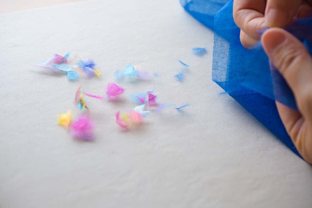 1000年以上の歴史ある和紙を手作業で数ミリの大きさにちぎり、何層にも貼り合わせていきます。