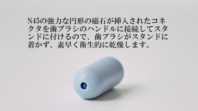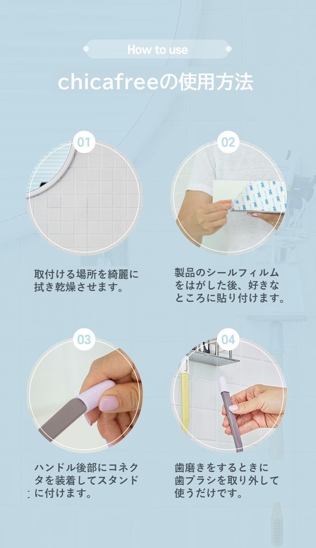 chicafreeは歯ブラシの速乾性とスタンドの水垢防止のため、強力磁石が挿入されたコネクタを歯ブラシのハンドルに接続してスタンドとの接触面を少なくして使用、保管する垂直型据置タイプの歯ブラシスタンドです。