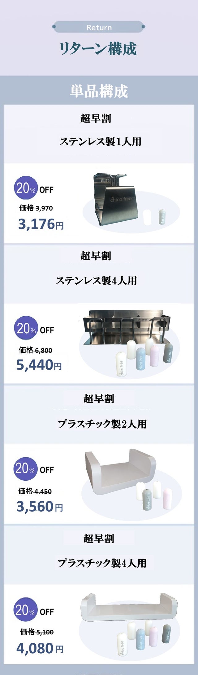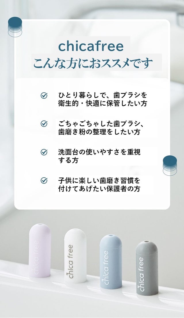 日々生活している中で、なかなか掃除が行き届かない所が歯ブラシスタンドです。しばらく放置して気付いてそうしたら水垢が取れなくなってしまった!そんな経験ありますよね。しかも歯ブラシスタンドは掃除しにくい形が多くないでしょうか?そこで、見つけたのがChicafreeです!もう歯ブラシスタンドの掃除を気にしないで済みます。歯ブラシの衛生面にもよく、実用性に優れた商品です。同じようなお悩みの方にぜひお使い頂きたいと思います。