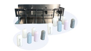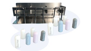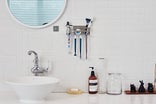 このように取付けた歯ブラシスタンドに、コネクタを装着した歯ブラシを付着させて、歯磨き粉とコップをセットすれば完了です。1~2人用から4人用まで様々なサイズとステンレス、ホワイトトーンのプラスチック素材の2タイプをご用意しました。ご自宅の洗面所にぴったりするものを選んでください。