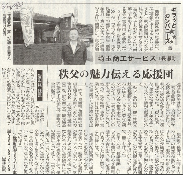 そういったなか、2017年4月の埼玉新聞「キラッとカンパーニーズ」にも「秩父の魅力伝える応援団」として取り上げていただきましたが、当社(株式会社 埼玉商工サービス 2012年創業)は、「秩父地域を元気にする!」をモットーに、地域経済活性化の一助にばればと思い、秩父地域の情報を伝えるポータルサイト「秩父見聞録」の運営や、長瀞町・皆野町の事業者情報や観光情報を伝える「みんなのお宝BOOK」を発行し、両町内に全戸配布をするなどしてまいりました。